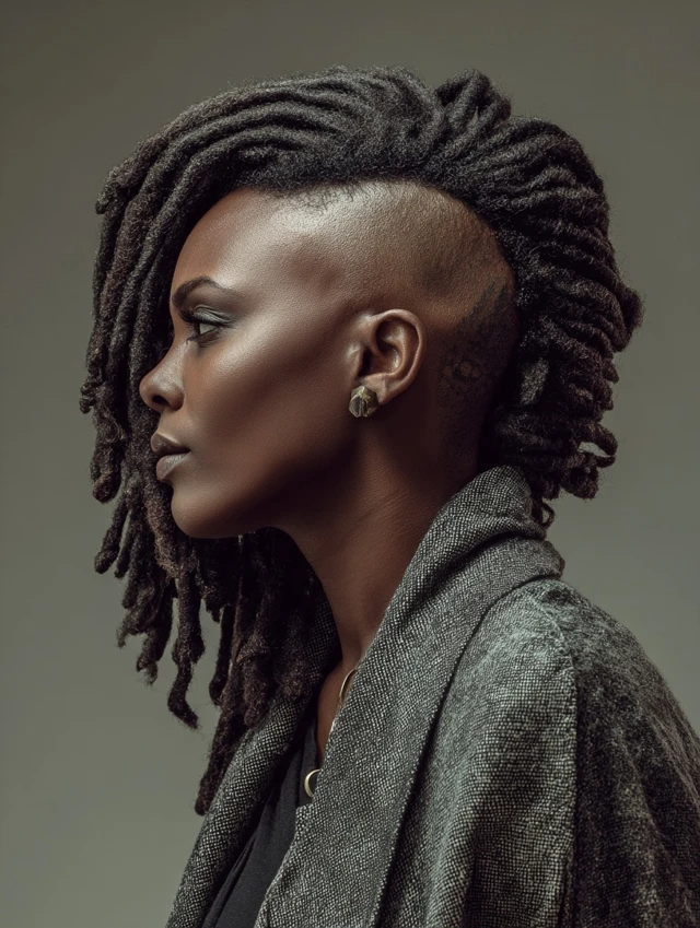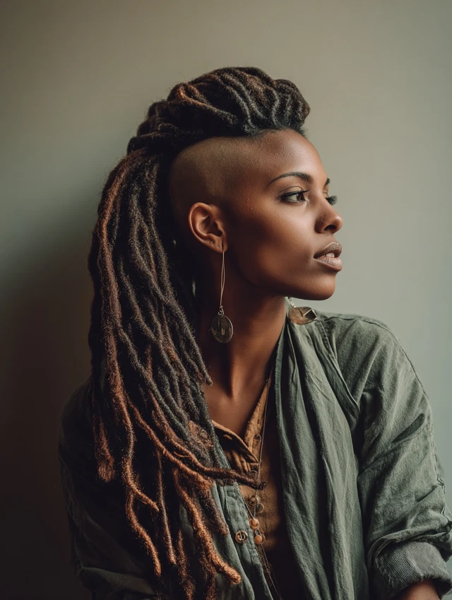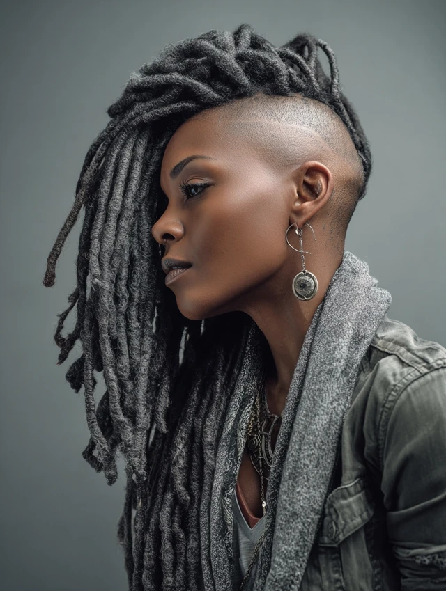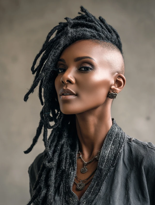 Locs cascade from one side while the opposite temple or nape stays shaved. The look balances tradition with rebellion.