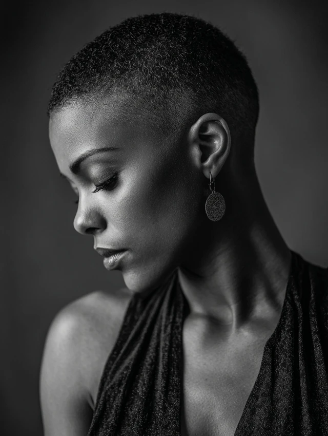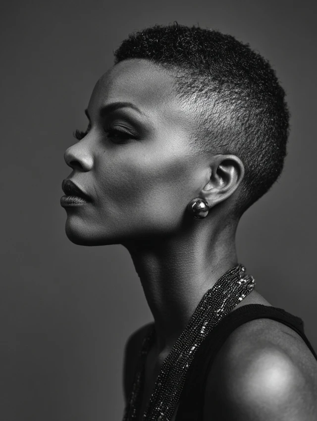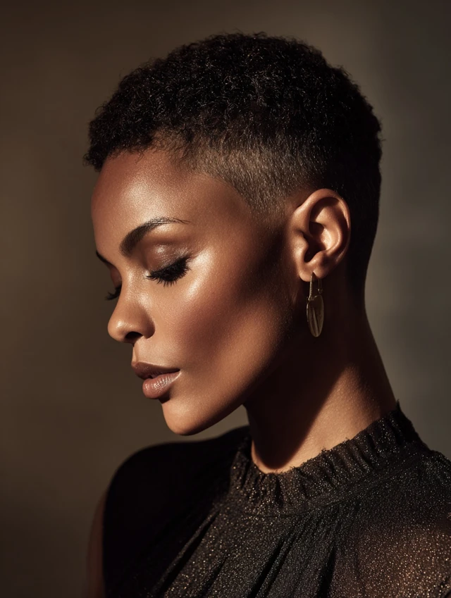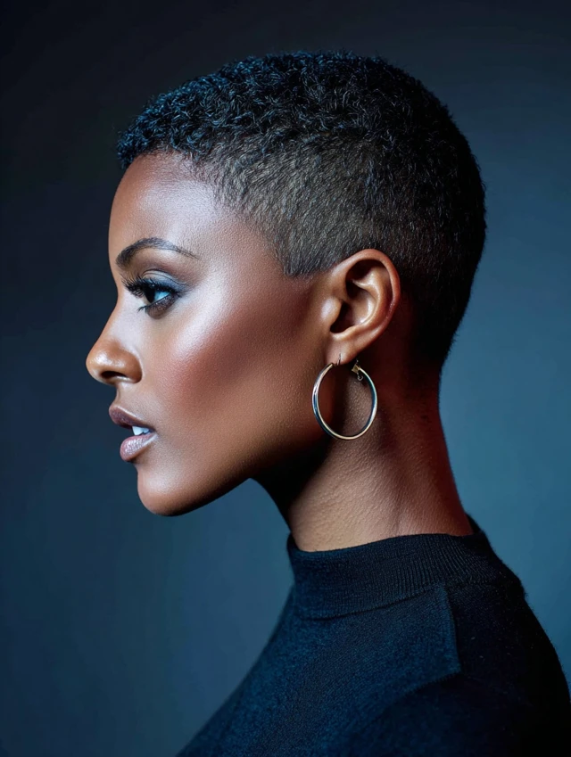A tapered natural cut with one shaved panel keeps things minimal and powerful. The short length puts facial features front and center.