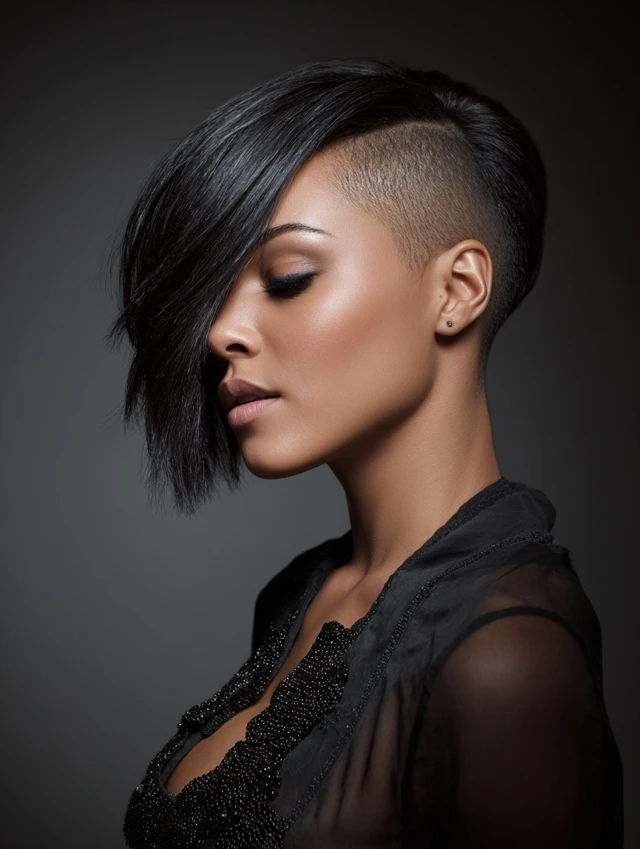 One side stays chin- or shoulder-length while the other is shaved close. The geometry feels sleek and fashion-forward.
