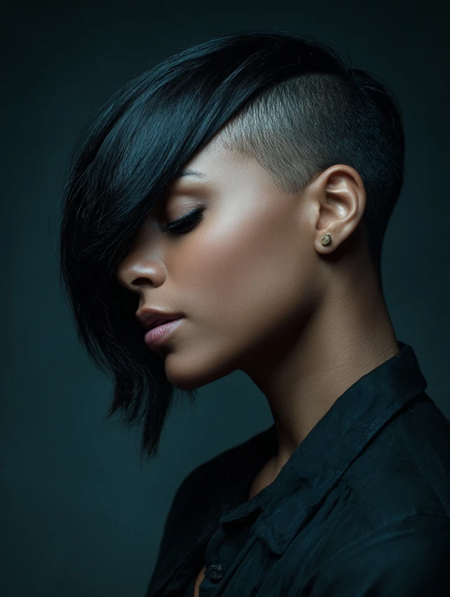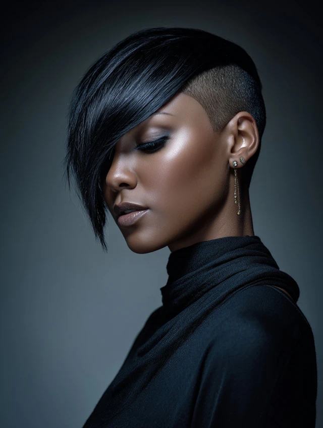Great for thick natural hair. Diffuse for lift. This style suits nights out and creative fashion. Frequent trims keep the shaved side sharp.