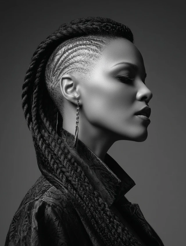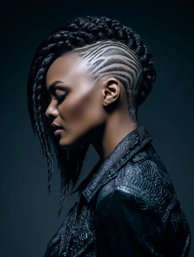 Cornrows or box braids cover the fuller side while the other stays bare or closely faded. The clean scalp design adds graphic impact.