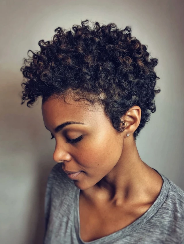 Springy curls shape into a rounded pixie with soft edges at the temples and nape. The texture keeps the look playful and youthful.