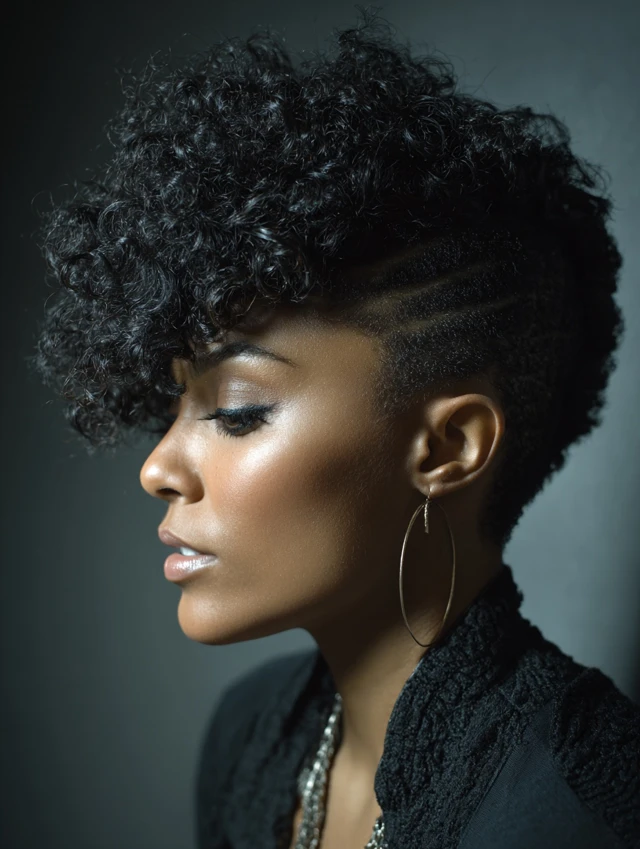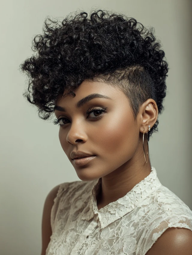 Curls or coils rise down the center while sides taper short, creating height and striking shape.