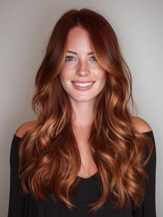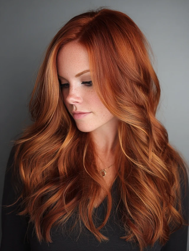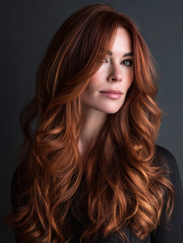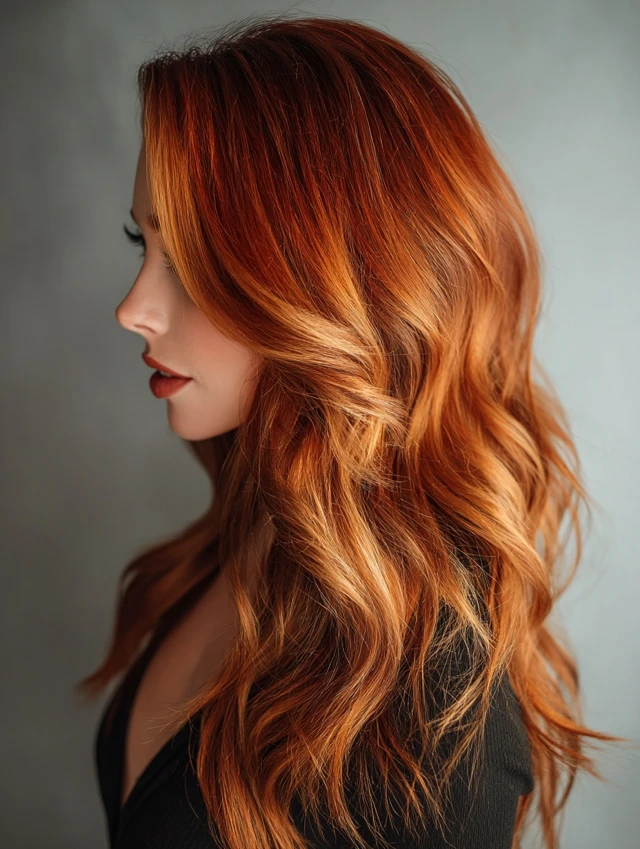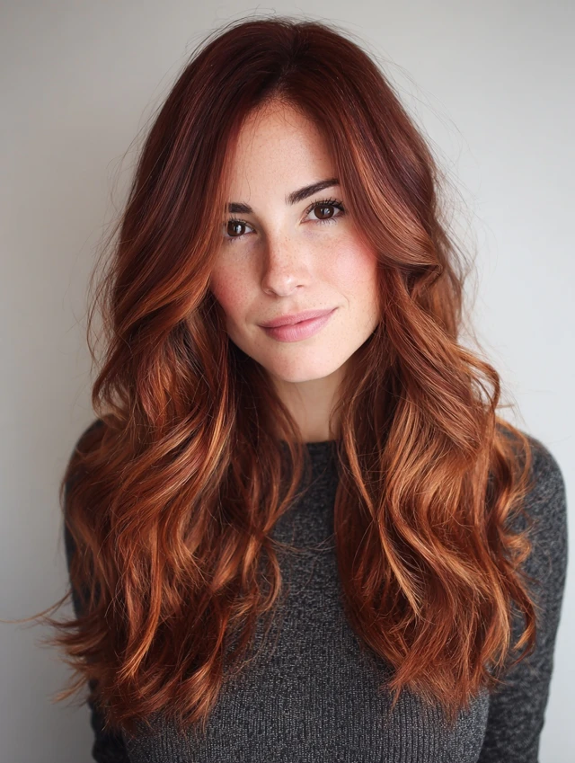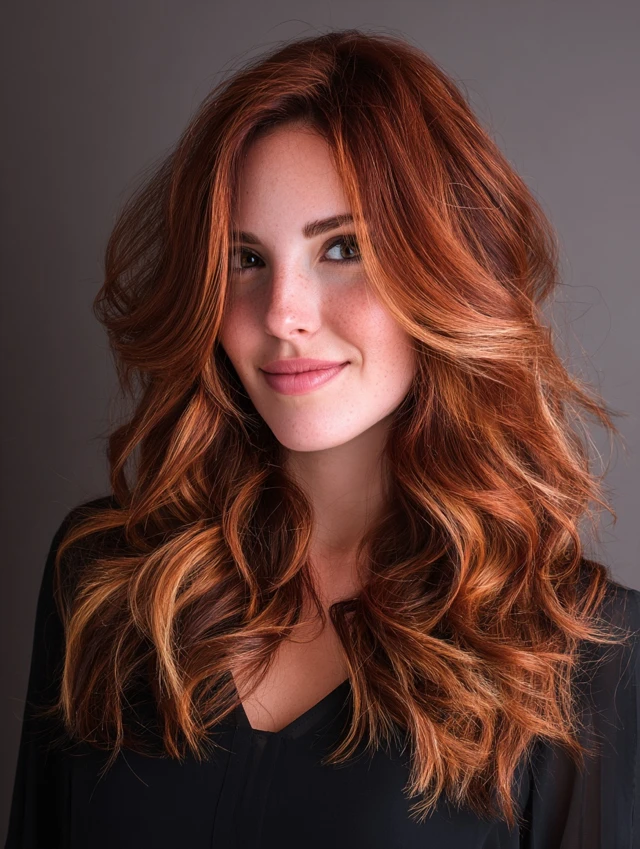 Red copper balayage offers glow, warmth, and eye-catching dimension without harsh lines. The mix of fiery ends and darker roots keeps the look sophisticated and easy to maintain.