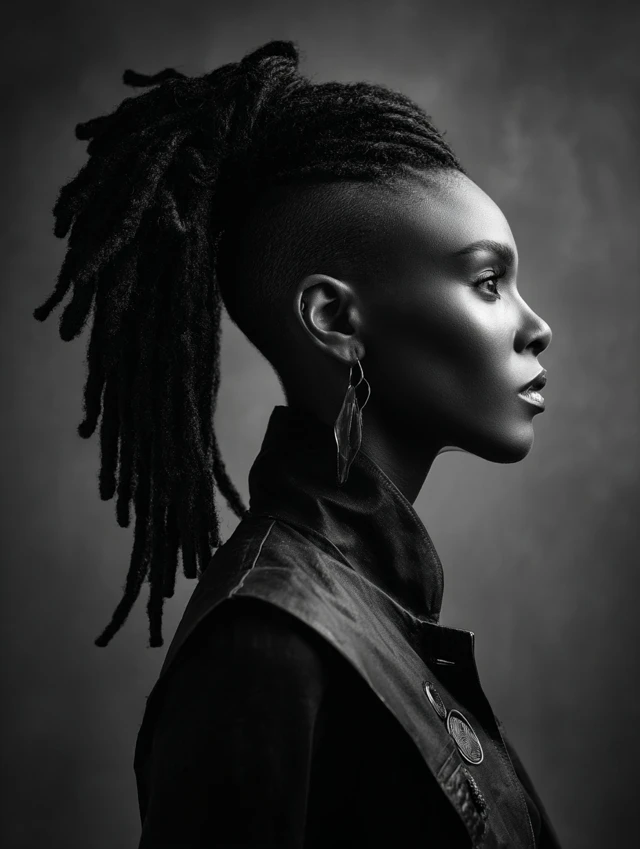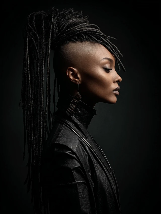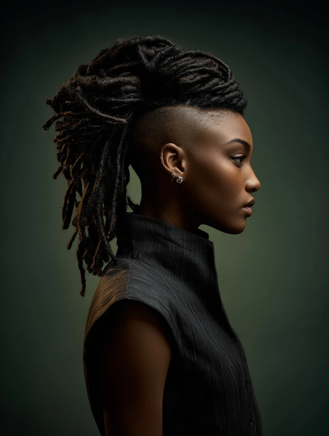 Locs gather into a high or mid ponytail while one or both sides remain shaved. The look balances tradition with rebellion.
