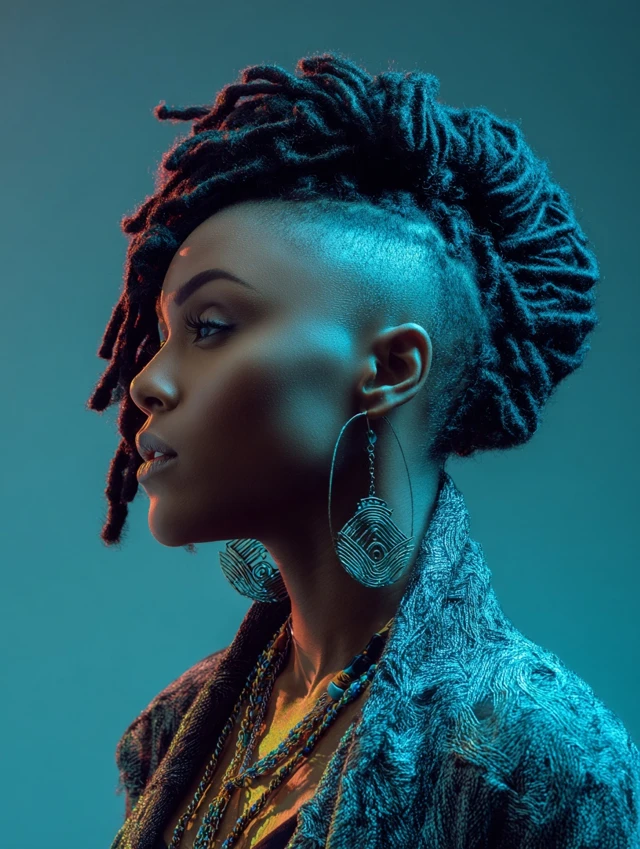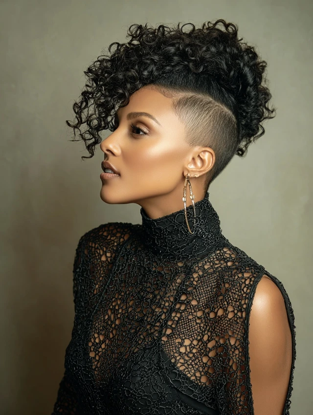 Great for natural curls or twist-outs. Diffuse upward for lift. This look fits nightlife, festivals, and statement outfits. Refresh shaved panels every few weeks.