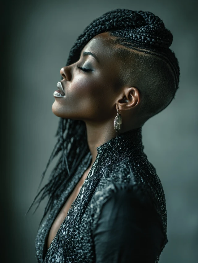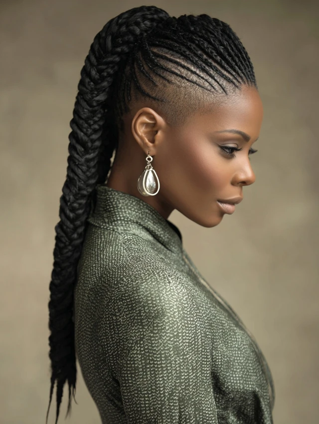 Cornrows or flat twists feed into a ponytail while shaved panels frame the temples or sides. The geometry feels sharp and graphic.