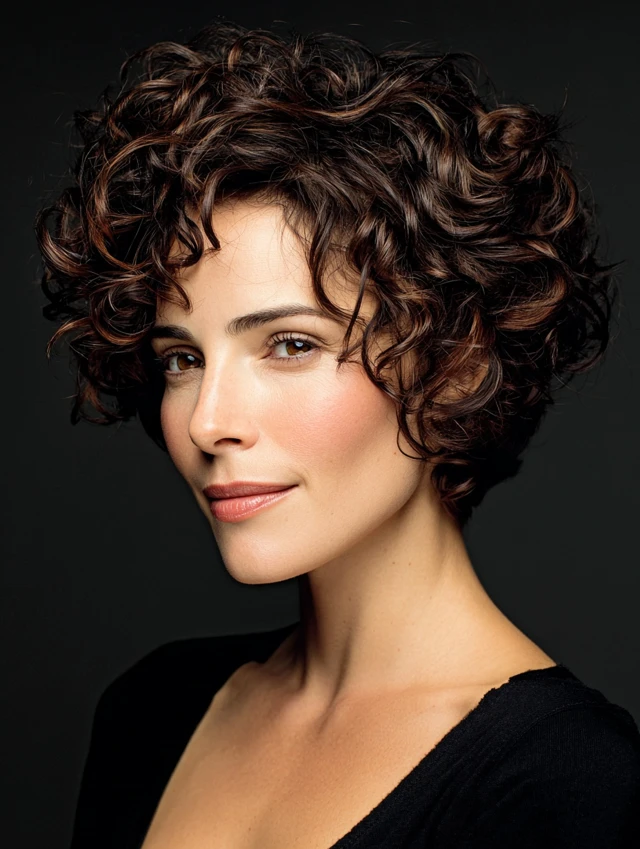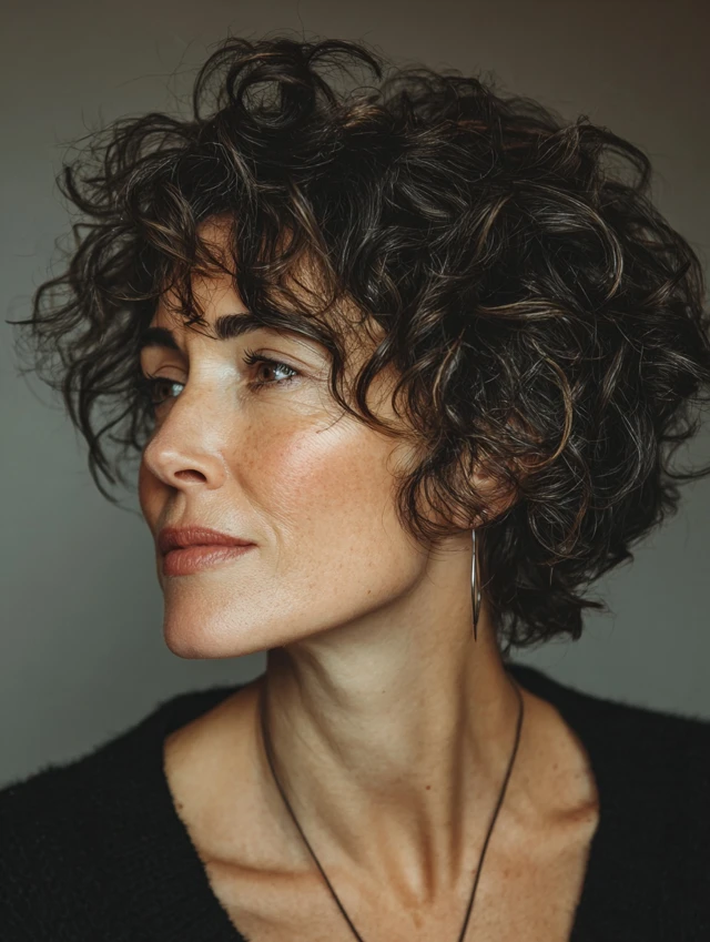 A curly short cut embraces natural curls, layering them to avoid bulk and create a flattering shape. This adds energy and dimension to the hairstyle.