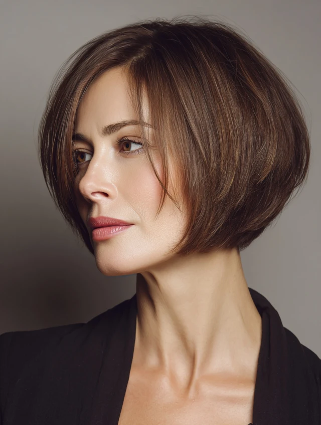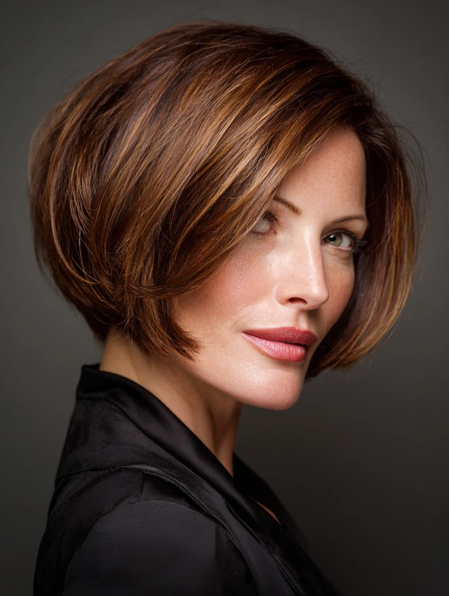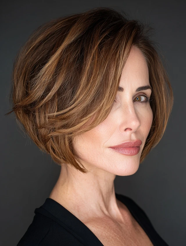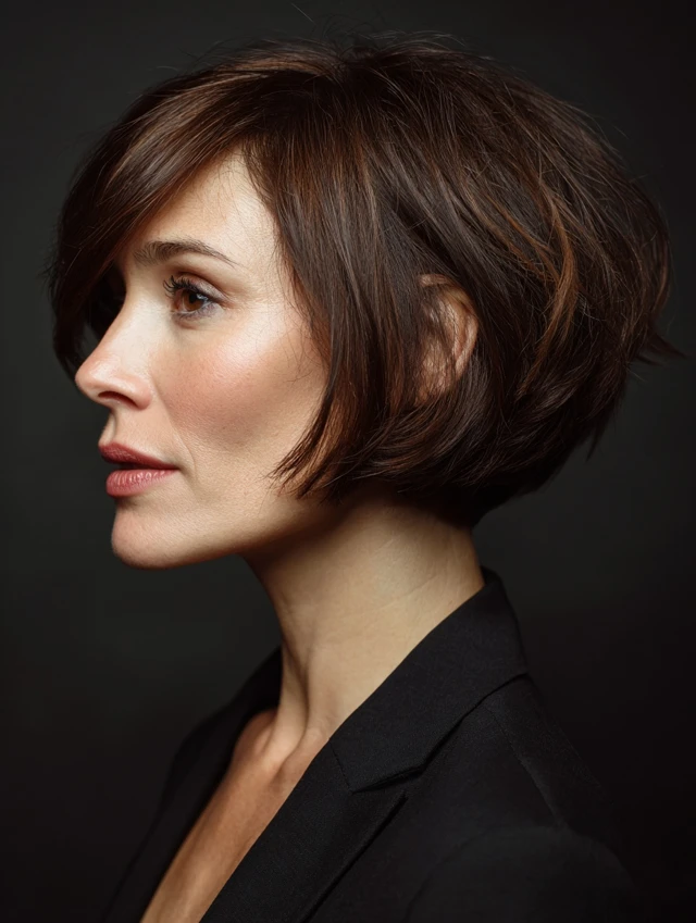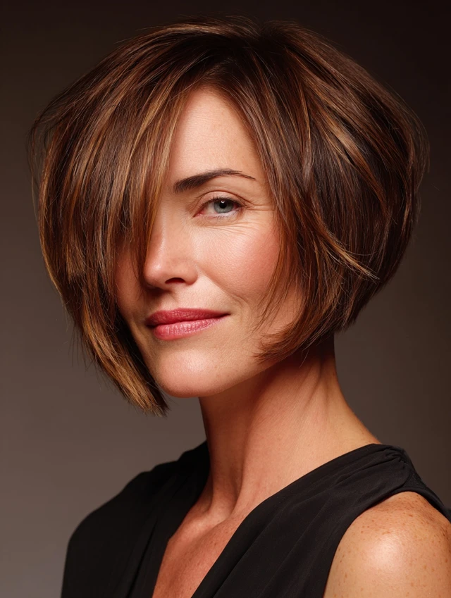 An angled short bob features longer front layers that frame the face while shorter back layers add lift. This shape adds sophistication and a slimming effect.