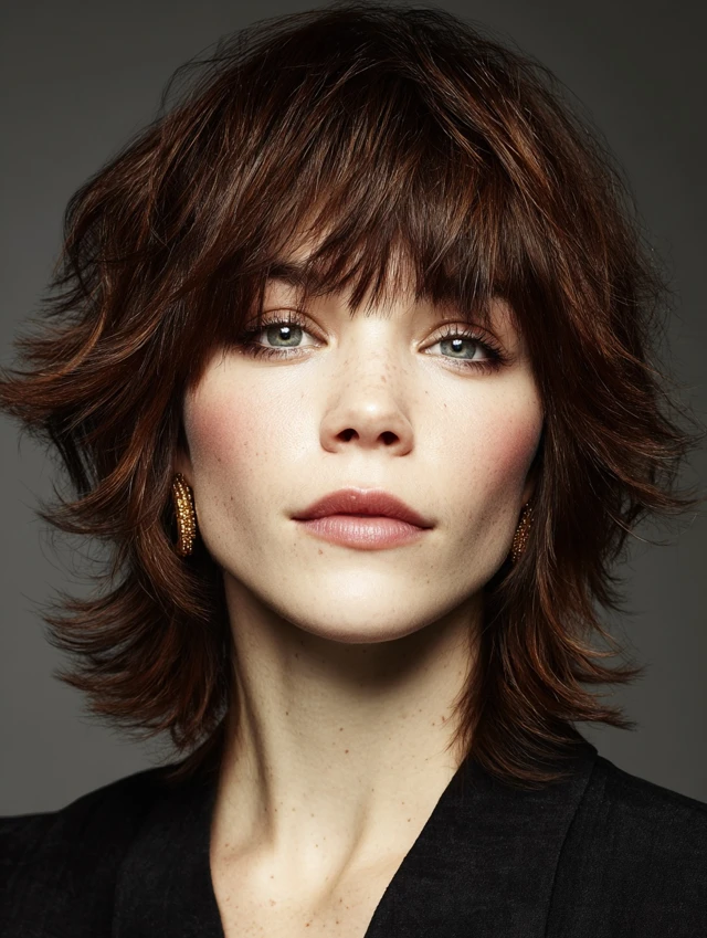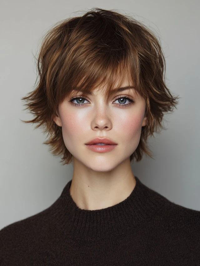The classic short shag features choppy layers at the crown and feathered ends with soft bangs. It frames the face naturally while adding volume. Works well for oval, heart, and round faces.
