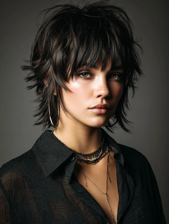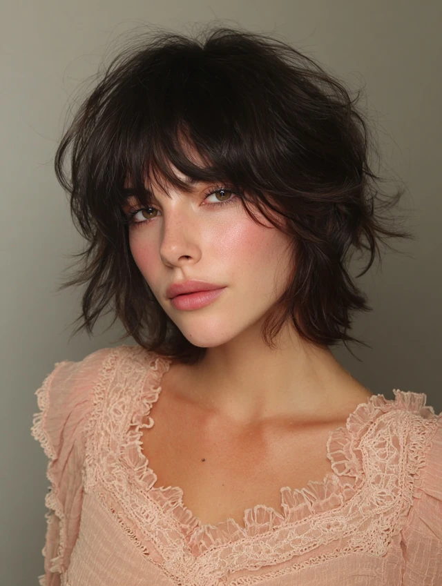 The short shag with bangs is a textured, playful haircut that adds volume and movement while framing the face. Layers at the crown create lift, and bangs soften features, making the style flattering for most face shapes. This haircut works for straight, wavy, or slightly curly hair, offering effortless edge and versatility. Styled messy, tousled, or slightly sleek, the short shag with bangs is low-maintenance yet bold, perfect for women seeking a modern, youthful look without heavy styling.