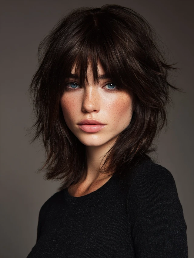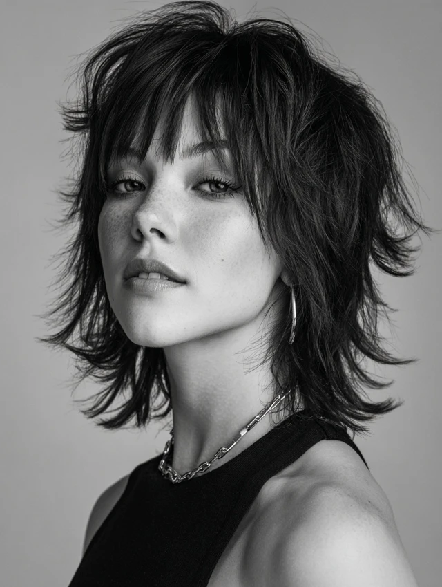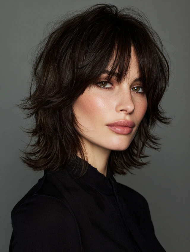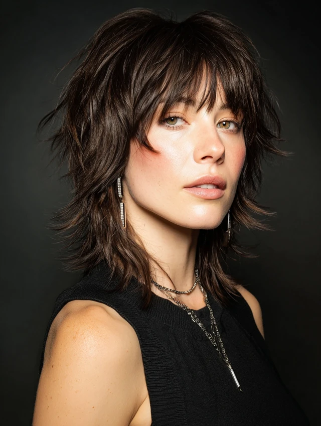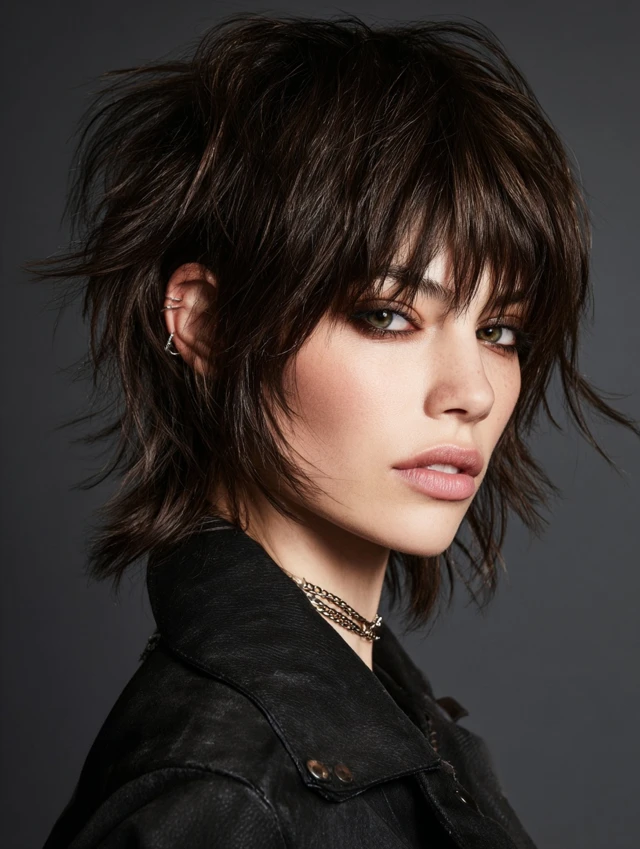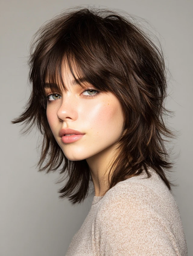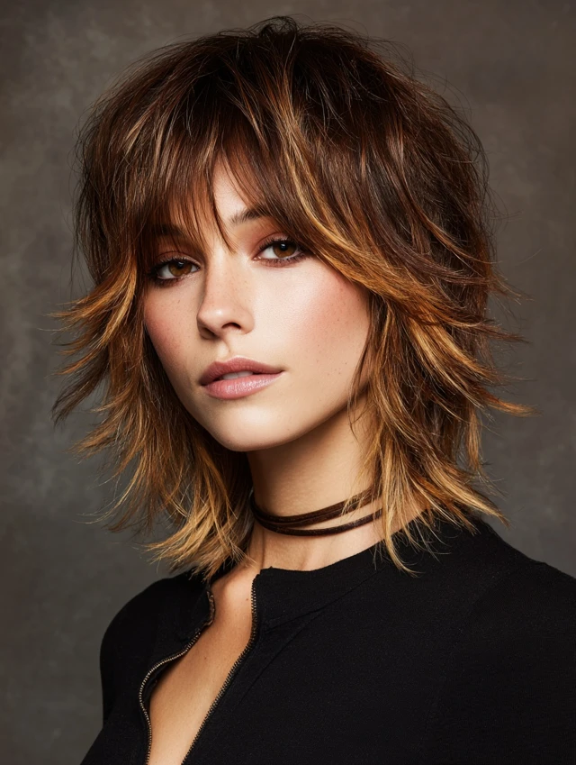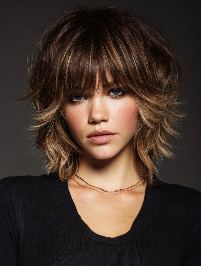 Edgy versions feature asymmetrical or choppy layers with feathered ends. Bangs soften bold angles while keeping the look dynamic. Works best for oval or heart-shaped faces.
