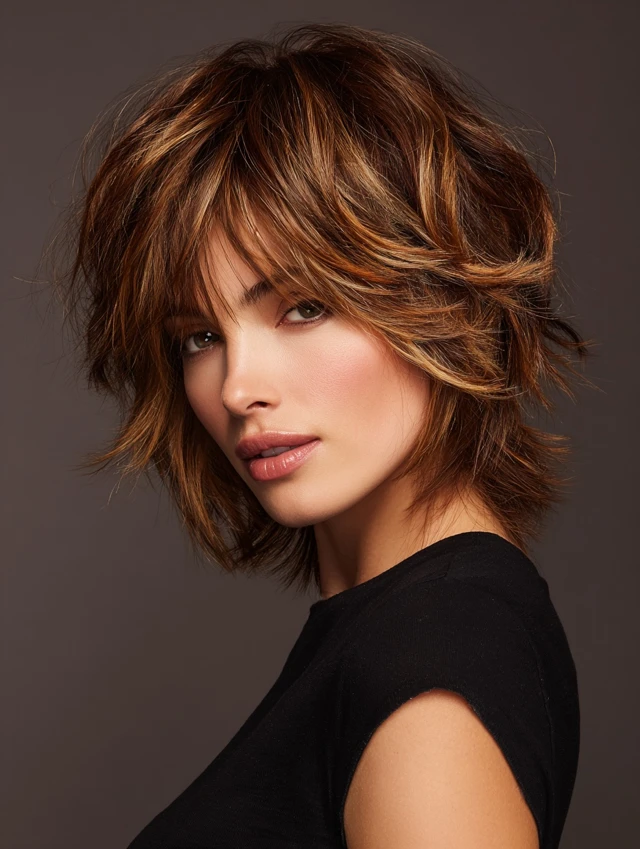 Highlights add depth and dimension to short shags. Soft bangs and layered crown enhance texture, creating a playful yet polished look. Works for all face shapes.