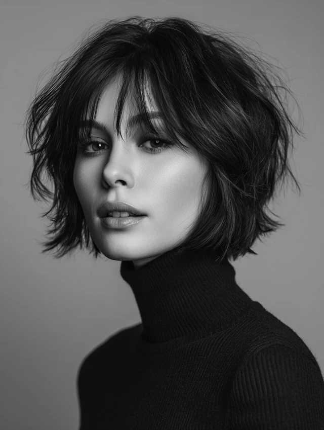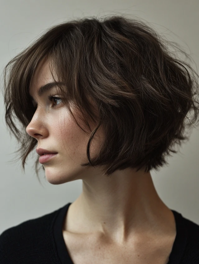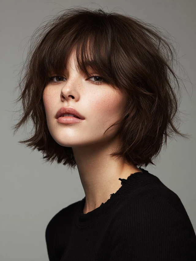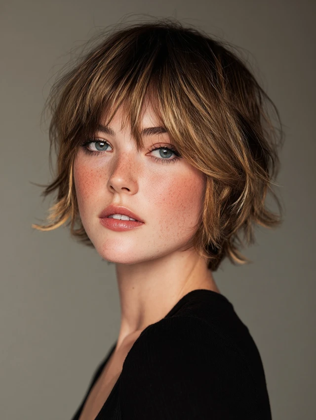 The short shaggy bob sits between the jaw and chin, combining a classic shape with modern texture. Layers break up the heaviness that bobs can create. This makes the face look softer and more balanced. It works especially well for round and oval face shapes. The shaggy finish prevents the cut from looking too polished or stiff.
