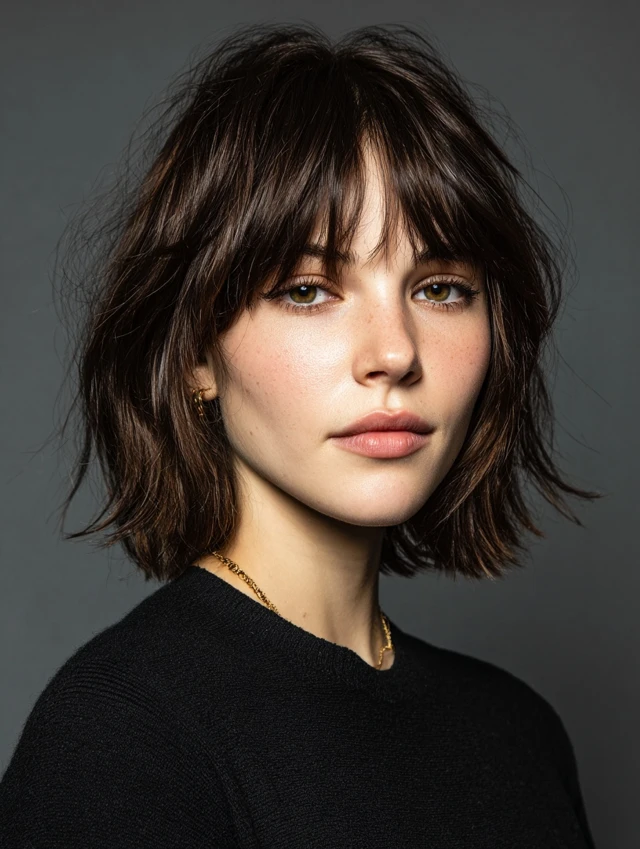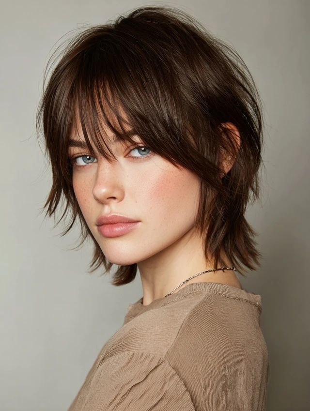 Choppy bangs add attitude to short shaggy haircuts. The uneven fringe contrasts with soft layers, creating a playful edge. This style works best for oval and longer face shapes. The bangs visually shorten the face and draw attention upward. It feels expressive without being extreme.