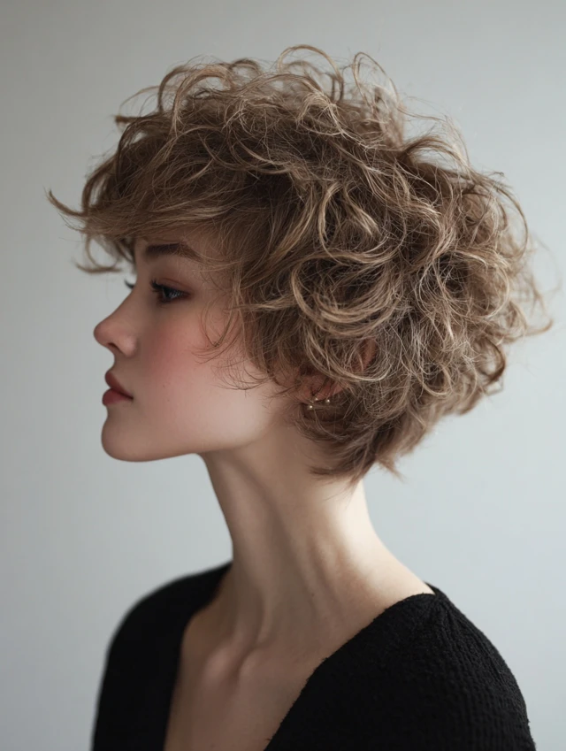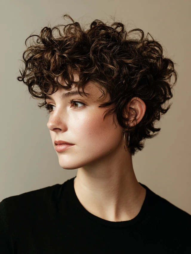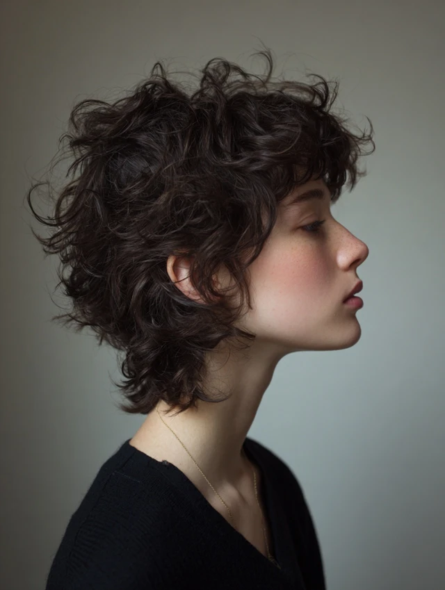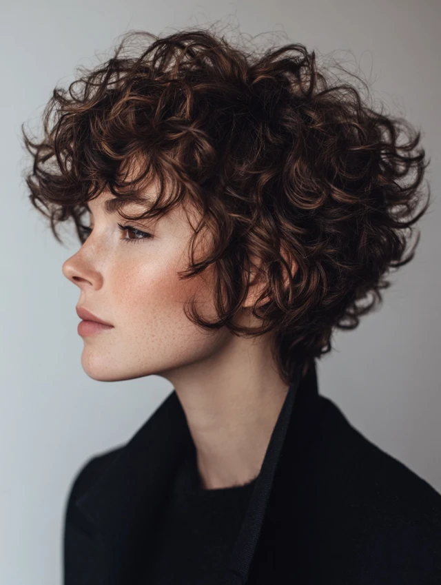 Curly short wolf cuts celebrate natural texture. Layers remove bulk and allow curls to spring freely. The crown stays lifted while ends remain feathered. Works well for round and square faces, softening features while keeping playful shape.