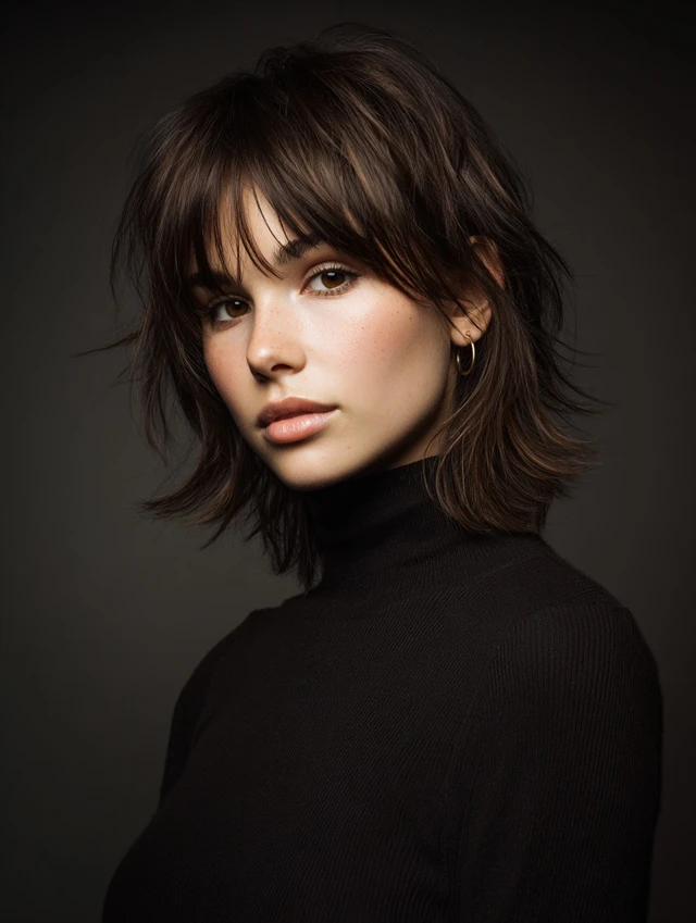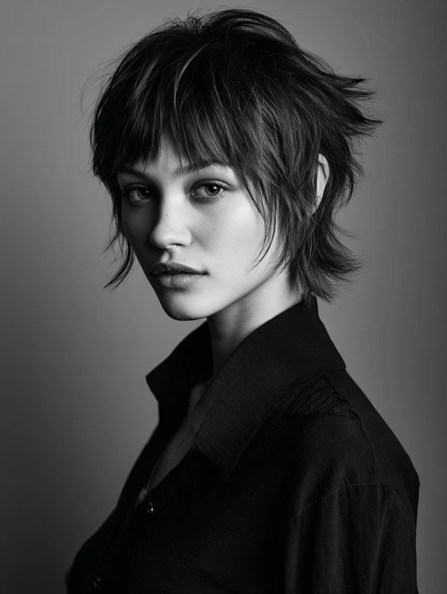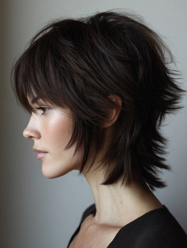 The classic short wolf cut balances crown volume with feathered ends. Layers add movement while keeping the silhouette sharp but soft at the edges. Works best for oval and heart-shaped faces, highlighting cheekbones and jawlines. This cut is edgy yet versatile, suitable for casual or professional settings.
