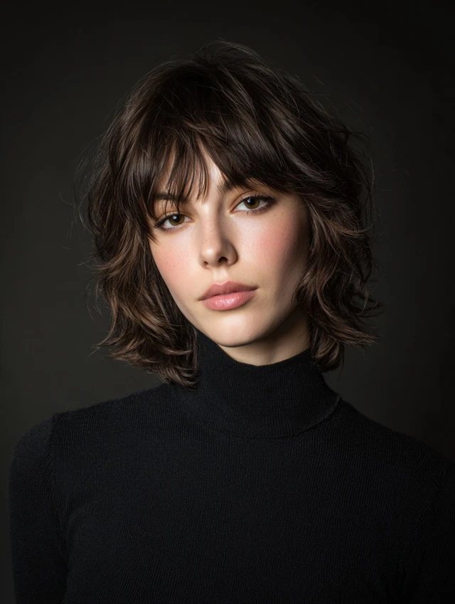 Choppy bangs add playful contrast to short wolf cuts. The uneven fringe draws attention to the eyes while balancing voluminous crown layers. Works best for oval and long face shapes. The cut feels bold without being extreme.
