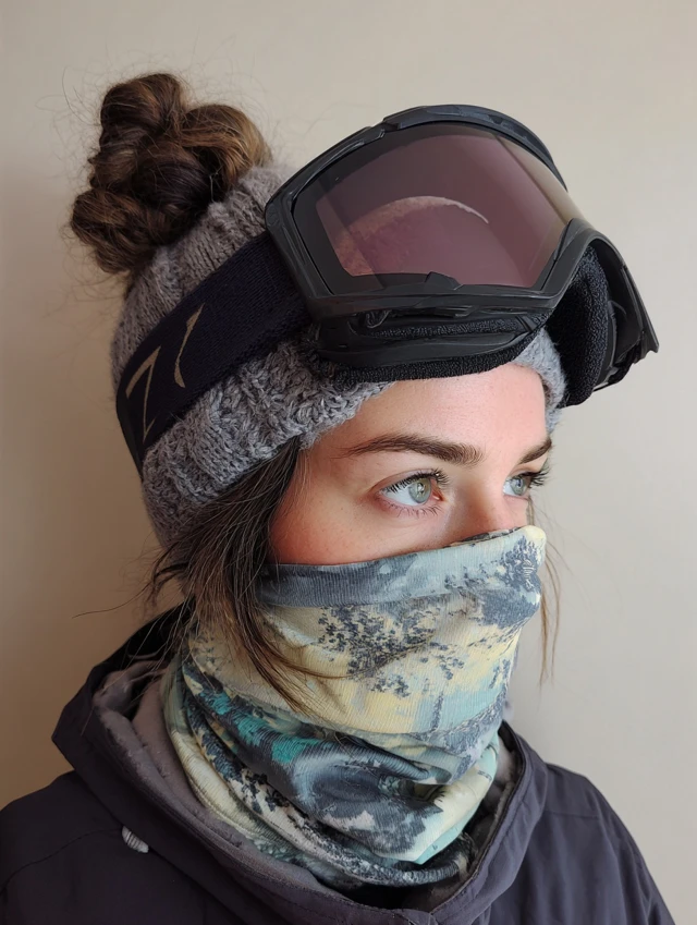 Hair gathers low, twists inward, and tucks under a gaiter or buff. The fabric keeps ends smooth and adds warmth.