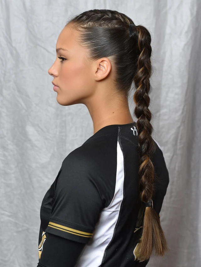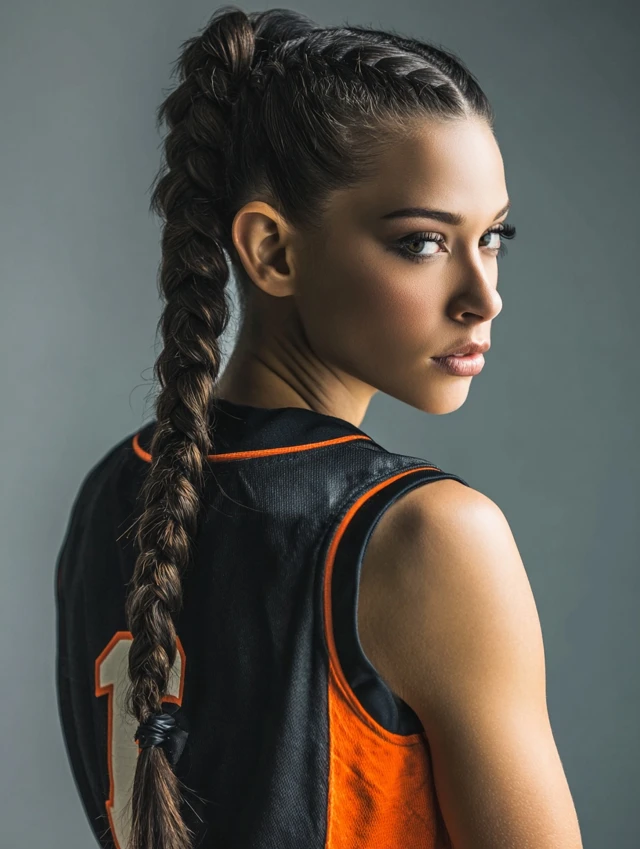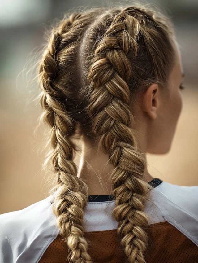 Braid on slightly damp hair with leave-in conditioner for grip. Secure the ends firmly and tuck them into the collar if needed. This style lasts full games and loosens into soft waves afterward.