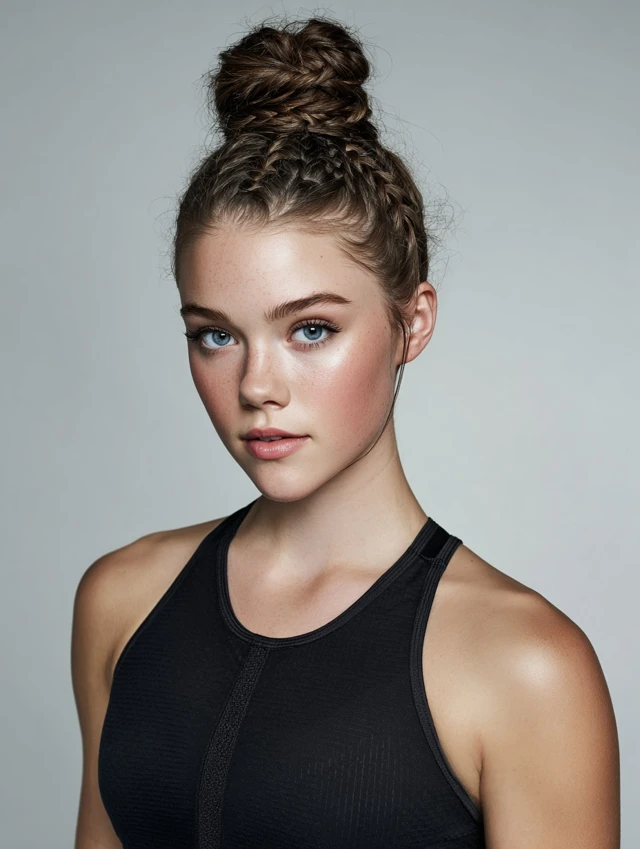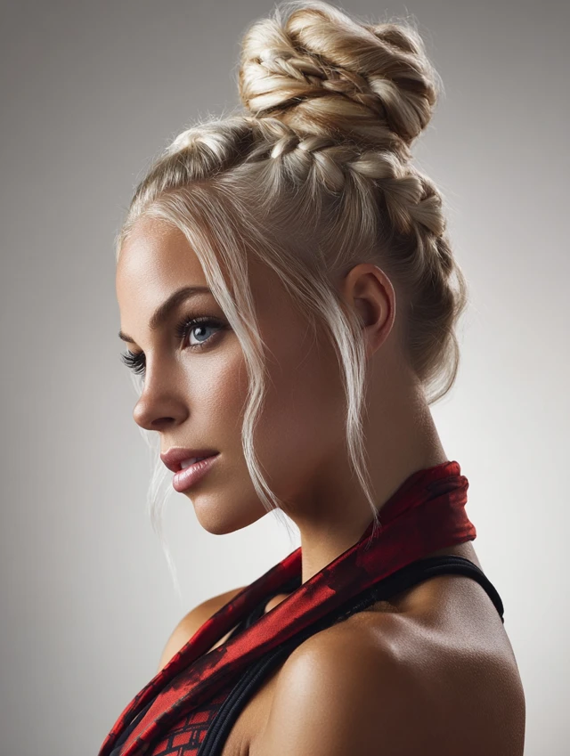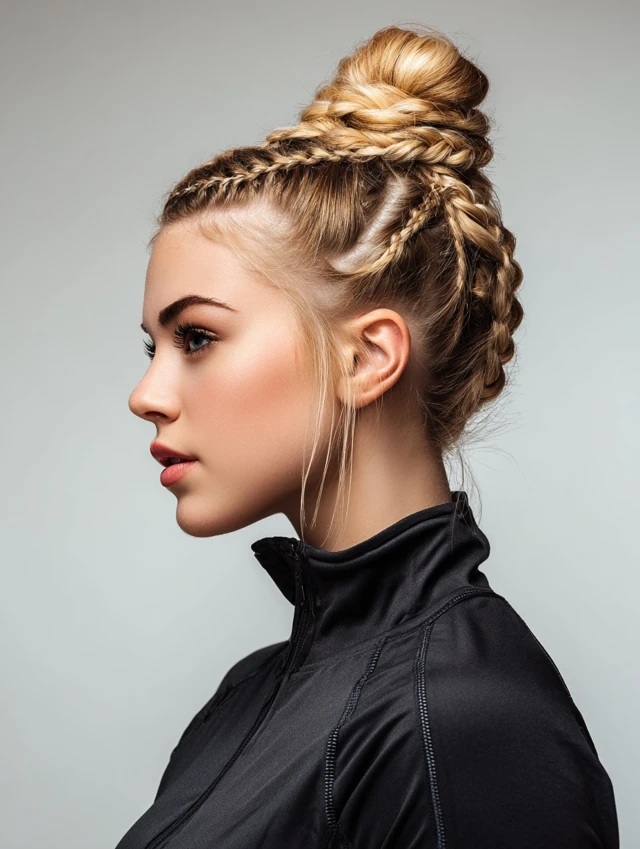 This style pulls hair straight up into a braid, then wraps it into a compact bun. It flatters round faces by adding height and keeps every strand off the neck.