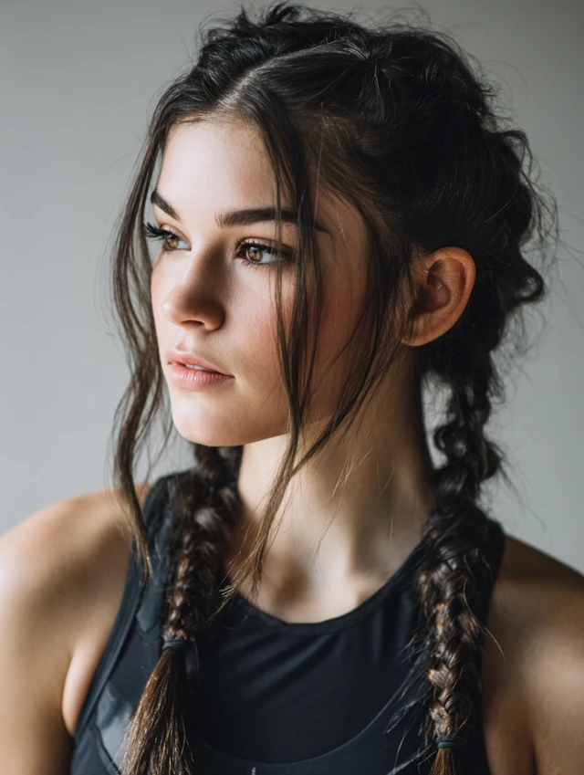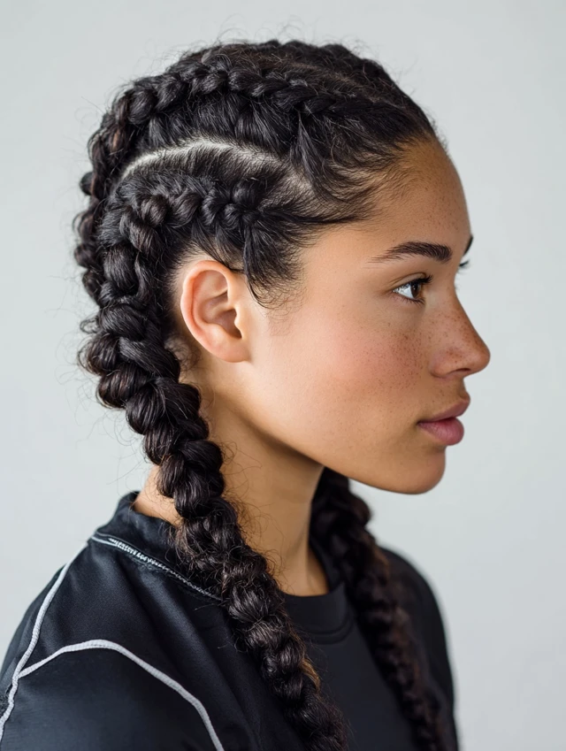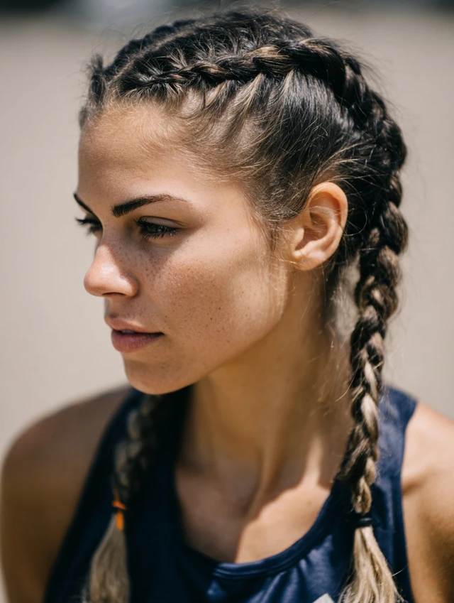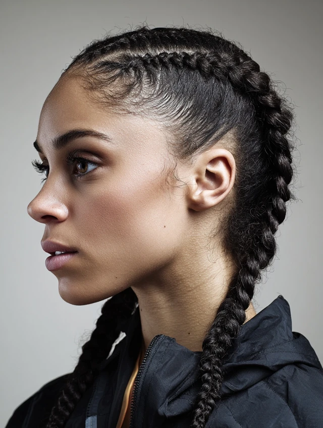 Two tight braids from the hairline back keep everything anchored. They suit most face shapes and work best on medium to long hair. Thick, curly, or textured hair benefits because strands stay contained even during dives.
