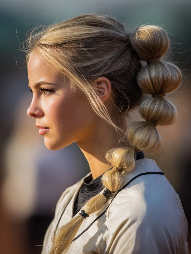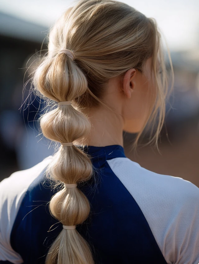 A bubble ponytail uses elastics spaced down the length to prevent tangling. It suits active players who hate hair whipping into their face. Medium to long hair shows the shape best.