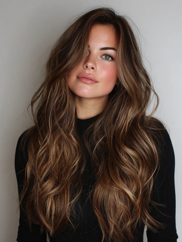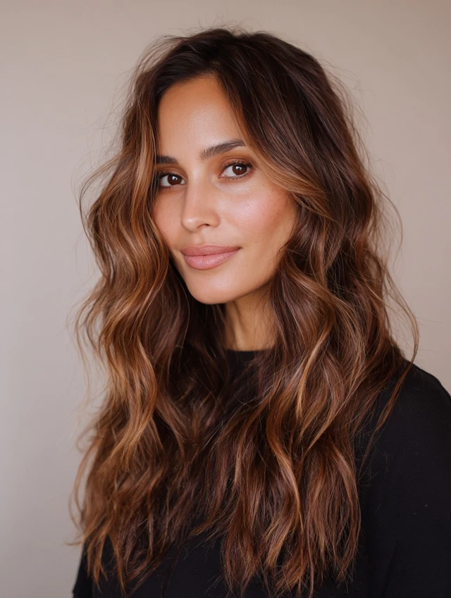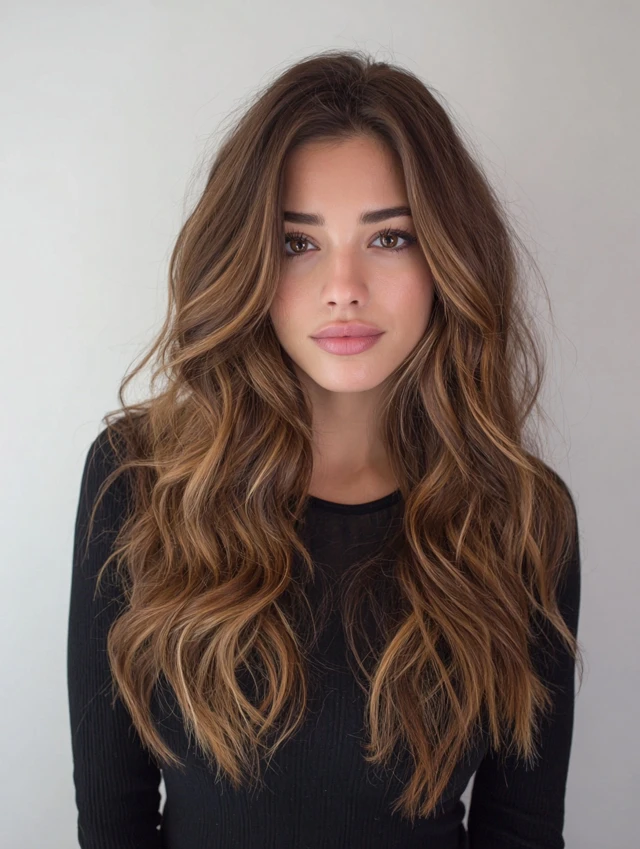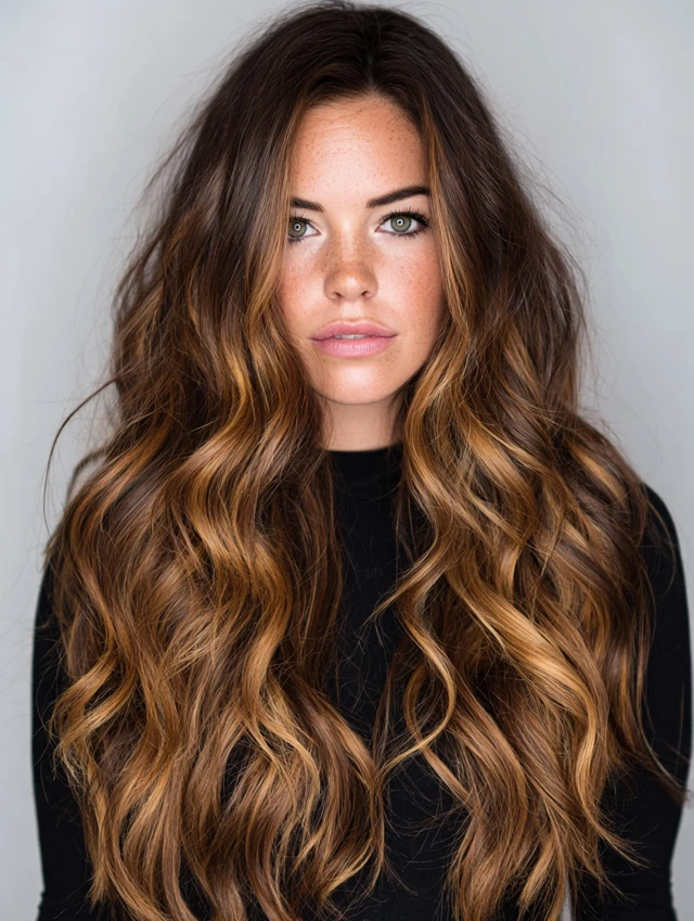 Warm caramel honey balayage blends golden honey tones with deeper caramel shades for a soft, glowing finish. This color combo brightens dark or medium bases without going blonde-blonde, which keeps everything rich and wearable. The hand-painted placement creates natural transitions from root to tip, adding dimension and movement. These tones flatter many skin undertones and reflect light beautifully, especially in waves or layered cuts. If you want warmth, shine, and subtle brightness without harsh contrast, this blend hits the sweet spot.