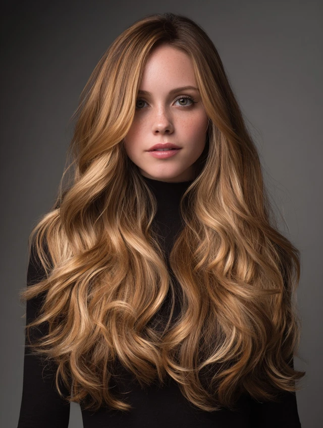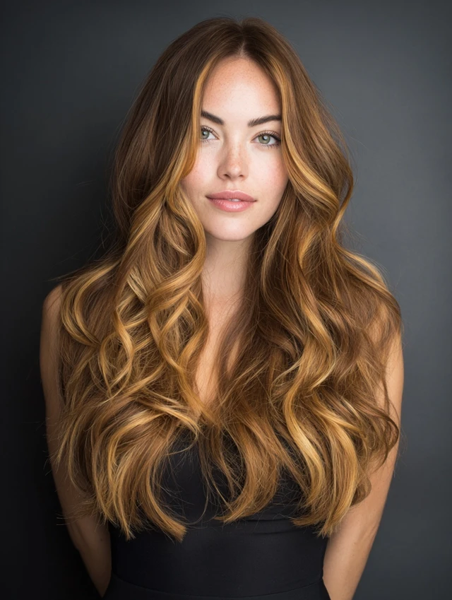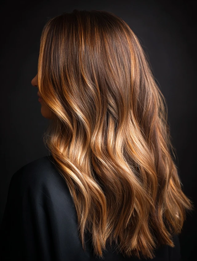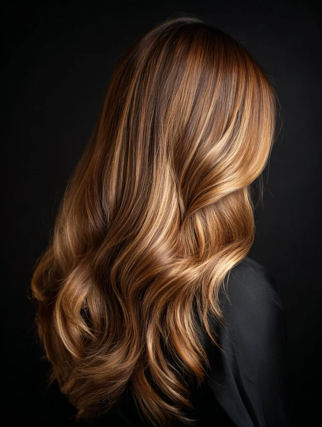 Honey ribbons sweep through mid-lengths while caramel shades deepen the base. The result feels balanced and luminous.