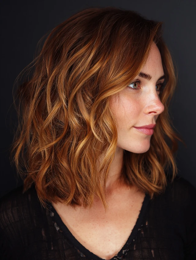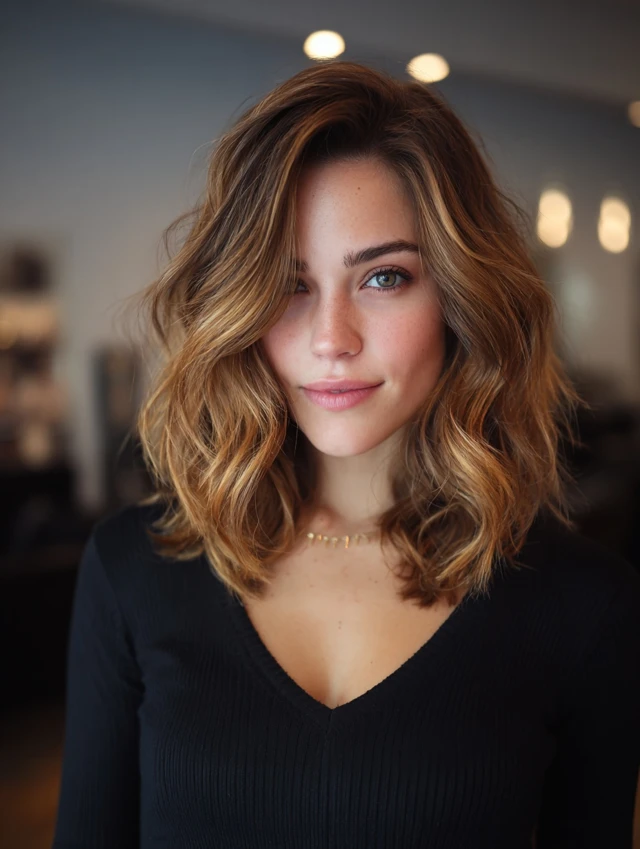 A shoulder-length lob with honey-caramel highlights keeps the look fresh and modern without high upkeep.