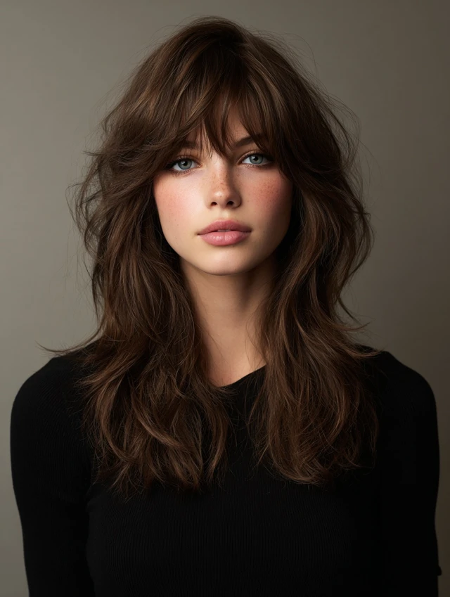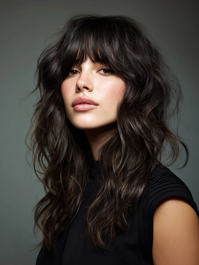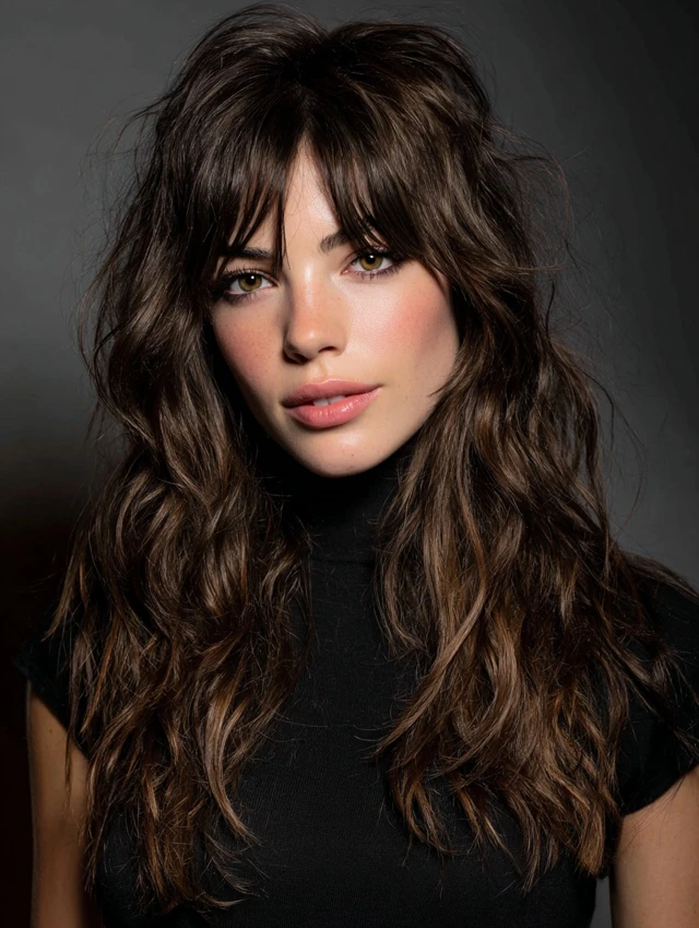 Curtain bangs blend seamlessly with wavy layers, softening the face and creating a balanced, playful look. Works best for oval and square faces, framing features while maintaining volume.