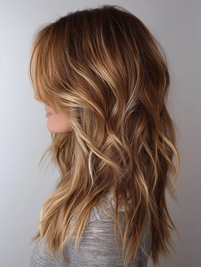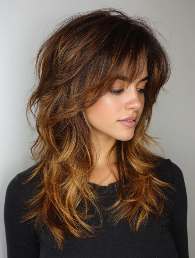 Adding highlights to a wavy wolf cut emphasizes layers and depth. Subtle shades like honey, caramel, or ash blonde create dimension without overwhelming the style. Works well for all face shapes.